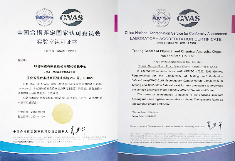 Laboratory accreditation certificate of China National Accreditation Service for Conformity Assessment