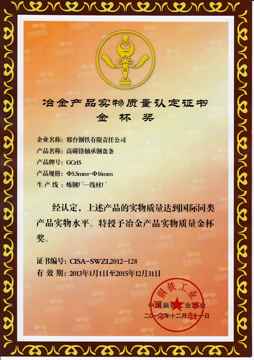 The φ5.5~16mm wire GCr15 for bearing awarded the Gold Cup Prize for Metallurgy products.