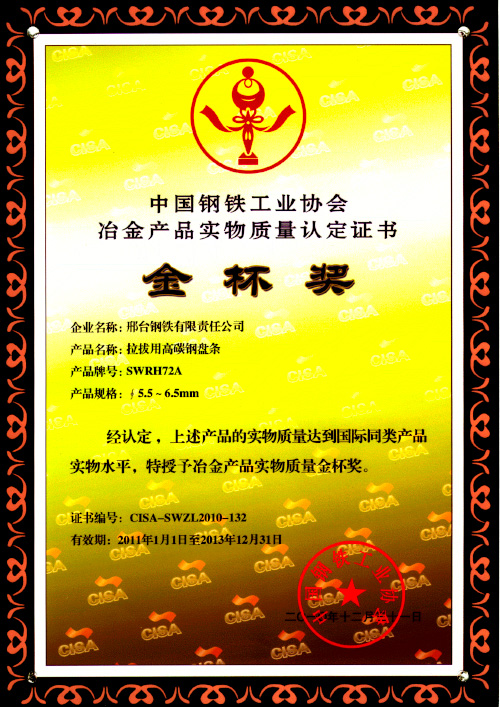 High carbon Wire SWRH72A for drawing awarded the Gold Cup Prize of Metallurgy products.