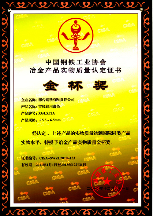 Wire XGLX72A for tire cord awarded the Gold Cup Prize of Metallurgy products.