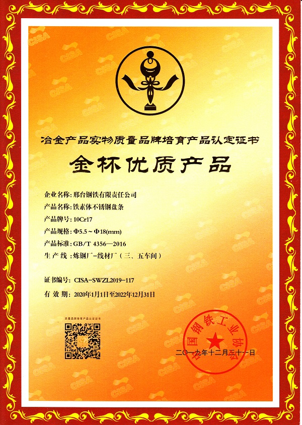 邢鋼鐵素體不銹鋼盤條10Cr17 φ5.5-18mm規(guī)格獲冶金產(chǎn)品實物質(zhì)量金杯優(yōu)質(zhì)產(chǎn)品認(rèn)定證書