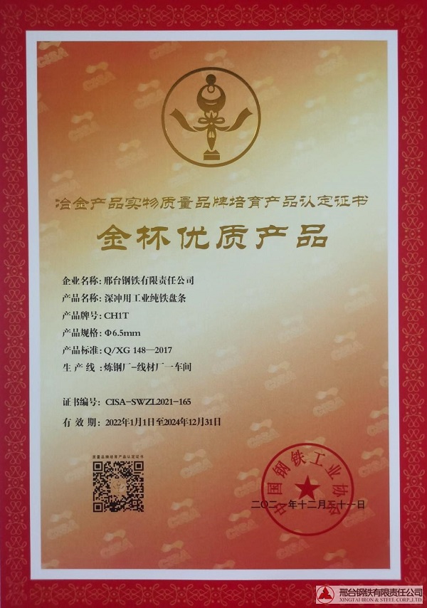 深沖用工業(yè)純鐵盤條CH1Tφ6.5mm規(guī)格獲冶金產(chǎn)品實物質(zhì)量金杯優(yōu)質(zhì)產(chǎn)品認(rèn)定證書