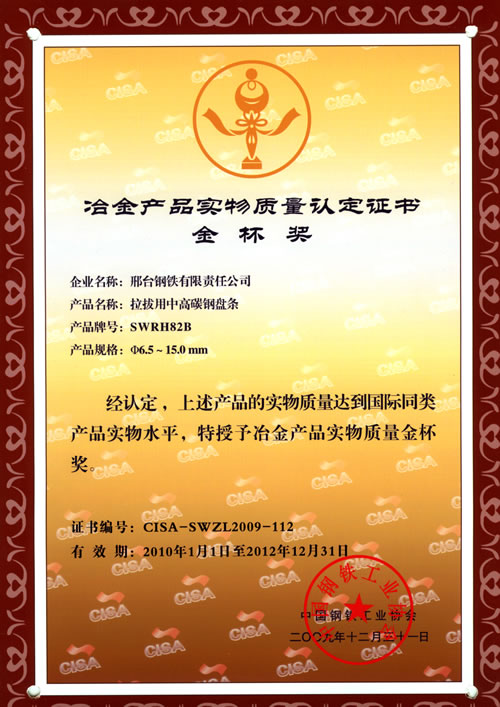 拉拔用中高碳鋼盤條SWRH82B獲冶金產品實物質量金杯獎