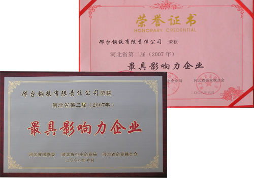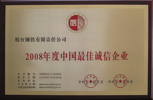 2008年12月,邢鋼榮獲由中國企業(yè)聯(lián)合會、中國企業(yè)家協(xié)會頒發(fā)的2008年度“中國最佳誠信企業(yè)”榮譽(yù)稱號。