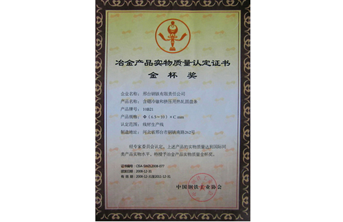 2008年12月31日,邢鋼含硼冷鐓和冷擠壓用鋼盤條10B21獲冶金產(chǎn)品實(shí)物質(zhì)量金杯獎(jiǎng)。
