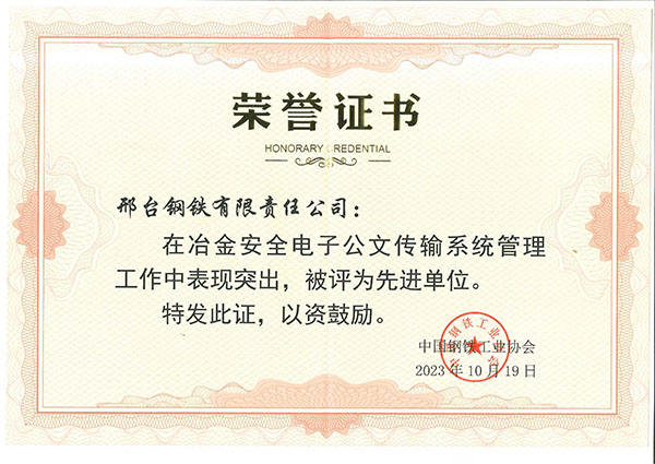 2023年10月,邢鋼在冶金安全電子公文傳輸系統(tǒng)管理工作中表現(xiàn)突出,被中國鋼鐵工業(yè)協(xié)會(huì)評(píng)為先進(jìn)單位。