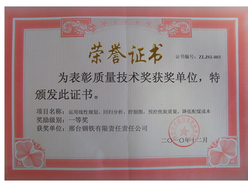 - 近日獲悉,我公司申報(bào)的“運(yùn)用線性規(guī)劃、回歸分析、控制圖預(yù)控焦炭質(zhì)量,降低配煤成本”質(zhì)量技術(shù)成果,經(jīng)河北省質(zhì)量技術(shù)獎(jiǎng)勵(lì)委員會(huì)評(píng)選,獲得一等獎(jiǎng)。該項(xiàng)目是焦化廠運(yùn)用質(zhì)量統(tǒng)計(jì)技術(shù)工具經(jīng)過(guò)實(shí)踐取得的一項(xiàng)質(zhì)量技術(shù)成果。通過(guò)實(shí)施該項(xiàng)目,配合煤成本比2008年降低了4775萬(wàn)元,保持了焦炭質(zhì)量的持續(xù)穩(wěn)定。