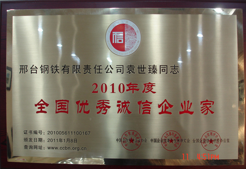 - 邢鋼榮獲2010年度“全國(guó)文明誠(chéng)信示范單位” 稱(chēng)號(hào)