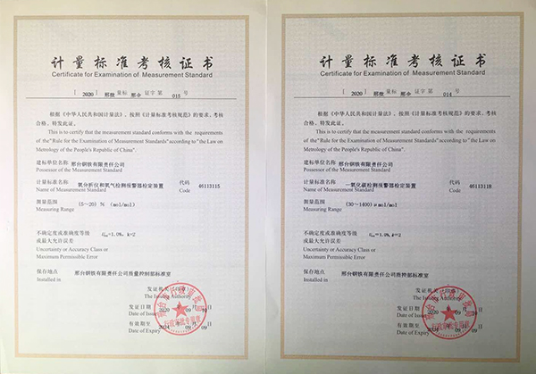 近日獲悉,邢鋼兩項企業(yè)最高計量標(biāo)準(zhǔn)《一氧化碳檢測報警器檢定裝置》和《氧分析儀和氧氣檢測報警器檢定裝置》獲得由邢臺市行政審批局頒發(fā)的《計量標(biāo)準(zhǔn)考核證書》。截至目前,邢鋼最高計量標(biāo)準(zhǔn)由15項增到17項,專業(yè)范圍由5類增加到6類。
