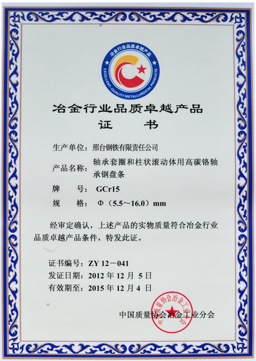 邢鋼公司生產(chǎn)的規(guī)格φ5.5-16mm 軸承鋼GCr15 獲得“冶金行業(yè)品質(zhì)卓越產(chǎn)品”榮譽(yù)稱號,為進(jìn)一步拓展市場、滿足高端用戶的質(zhì)量需求提供了質(zhì)量保證能力。