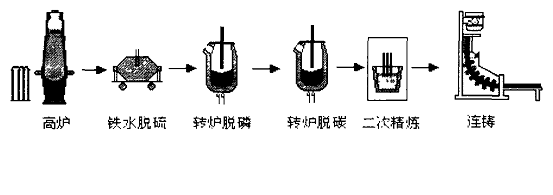 轉爐雙聯法工藝日本住友和歌山廠稱SRP法、新日鐵室蘭廠稱ID-ORP法、NKK福山廠稱LD-NRP法,其操作方式都是采用兩座轉爐雙聯作業(yè),一座進行鐵水脫磷操作,稱為脫磷爐,另一座轉爐接受來自脫磷爐的低磷鐵水進行脫碳操作,該轉爐稱為脫碳爐。也就是將鐵水脫磷和脫碳分開由兩座轉爐來完成,有別于傳統上在一座轉爐內既要完成鐵水脫磷又要完成脫碳。流程為高爐鐵水--鐵水脫硫預處理--轉爐脫磷--轉爐脫碳--二次精煉--連鑄。新日鐵名古屋廠于1989年12月開始在轉爐內進行鐵水的脫硅、脫磷、脫碳處理(LD-ORP)。該工藝可省略預脫硅步驟,且全流程產生的渣量可減少25%。其實質和住友金屬的SRP精煉工藝相似,該廠98%的鐵水利用此工藝進行處理。采用此工藝可生產磷含量小于0.005~0.01%的優(yōu)質鋼。該工藝除了可回收利用脫碳爐渣,降低熔劑消耗外,同時還可以增加6%的廢鋼比。