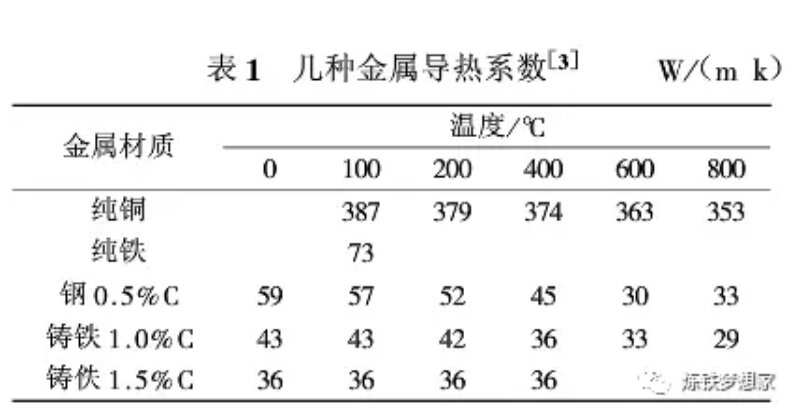 2000年以來銅冷卻壁以其良好的導熱能力和形成渣皮能力在我國高爐上得到廣泛的使用,目前全國約200座以上的高爐采用銅冷卻壁,尤其是在爐腹、爐腰和爐身下部等熱負荷較高的區(qū)域。高爐冷卻壁主要包括鑄鐵和純銅,另外還出現(xiàn)過鑄鋼冷卻壁。鑄鐵冷卻壁抗熱震性能差、導熱系數(shù)低。另外,其冷卻水管是鑄入鑄鐵本體內的,由于材質和膨脹系數(shù)的不同,形成氣隙層,而影響了傳熱。這些缺陷限制了鑄鐵冷卻壁的進一步發(fā)展。因此,從上世紀70年代歐洲開發(fā)和使用了銅冷卻壁,得到較好的效果。表1為幾種不同金屬導熱系數(shù),可以看出純銅的導熱系數(shù)遠優(yōu)于其他材料。