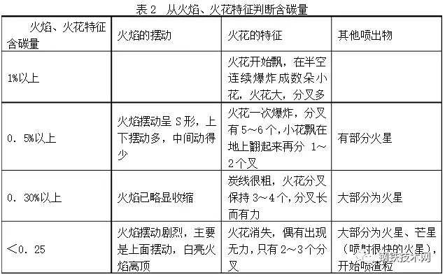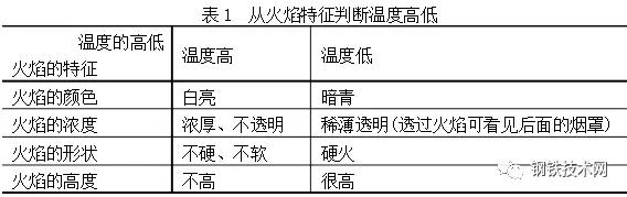 由上二表可見(jiàn)不能只憑一種“視覺(jué)信號(hào)”就判斷出爐內(nèi)的情況,而是根據(jù)多種信號(hào)綜合判斷爐內(nèi)情況,例如要從火焰的顏色、濃度、形狀、高度等來(lái)綜合判斷爐內(nèi)溫度情況。在判斷終點(diǎn)含碳量時(shí),既要看火花特征,還可考慮火焰形狀的變化。在收高碳時(shí)要看火焰擺動(dòng)的幅度,由大至小,在收低碳時(shí)要看火焰下降情況。