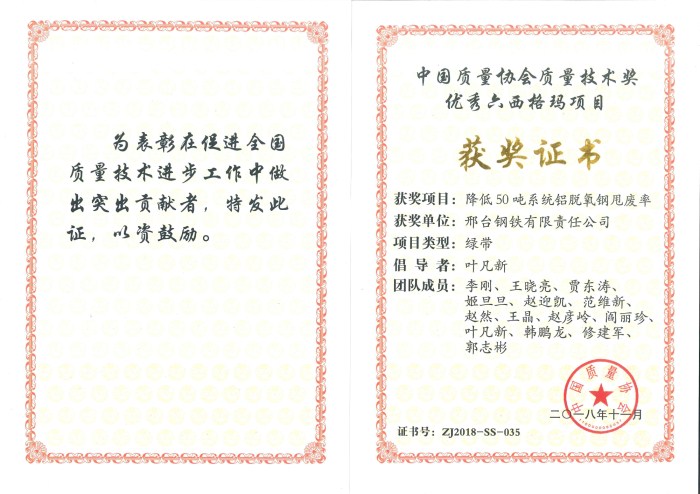 邢鋼榮獲2018年中國質(zhì)量協(xié)會六西格瑪優(yōu)秀項目獎