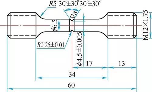 第三,試樣的制造。按圖沿材料的順纖維方向加工試樣,粗加工后熱處理至所要求的抗拉強(qiáng)度,然后精加工至規(guī)定尺寸,缺口用中軟細(xì)粒氧化鋁砂輪磨制。磨削時(shí)應(yīng)保證缺口根部半徑圓滑。磨削后投影檢查,確保缺口尺寸符合圖紙要求。逐根測量缺口根部直徑(圖中為φ4.5±0.05mm)的尺寸,并做好編號記錄。