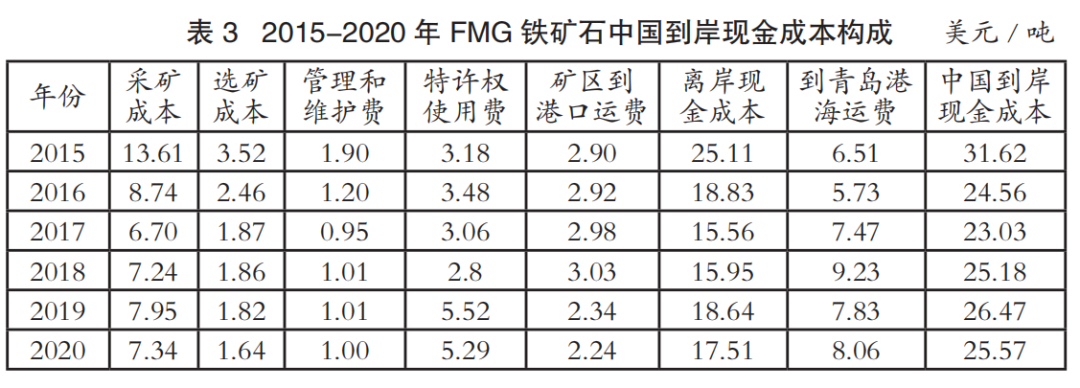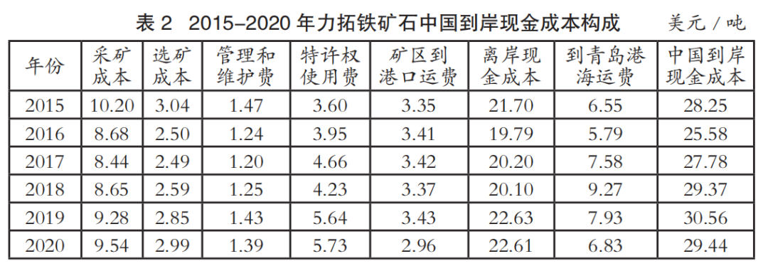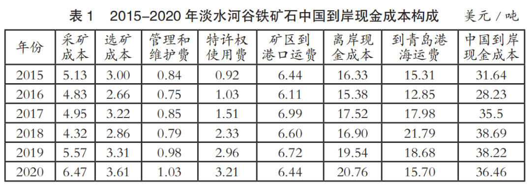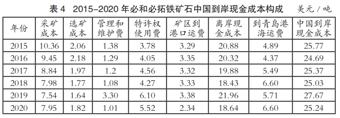 中國進(jìn)口鐵礦石到岸成本主要由離岸現(xiàn)金成本和海運成本兩部分構(gòu)成。表1至表4為2015-2020年國際四大礦鐵礦石中國到岸現(xiàn)金成本構(gòu)成情況(數(shù)據(jù)來源:AME),其中離岸現(xiàn)金成本由采礦成本、選礦成本、管理和維護(hù)費、特許權(quán)使用費和礦區(qū)到港口運費構(gòu)成;中國到岸現(xiàn)金成本由離岸現(xiàn)金成本和到青島港海運費構(gòu)成;該成本數(shù)據(jù)僅為現(xiàn)金成本,不含國際四大礦的融資、折舊費用。