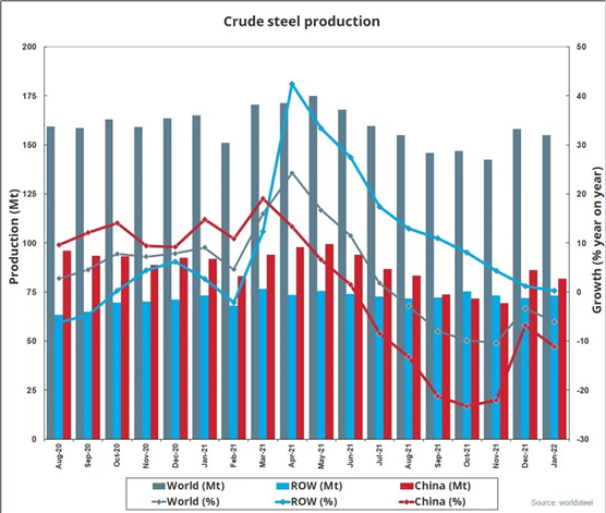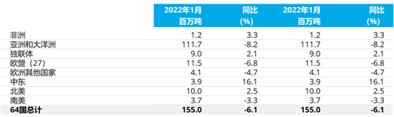 2022年1月全球64個(gè)納入世界鋼鐵協(xié)會統(tǒng)計(jì)國家的粗鋼產(chǎn)量為1.550億噸,同比下降6.1%。