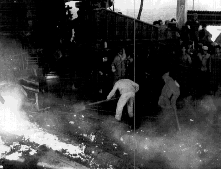 圖為1978年邢鋼鑄鐵出坯的情景,鐵塊紅火,邢鋼人為出爐的鐵水歡呼。兩年后的1980年,邢鋼10000噸低磷低硫高質(zhì)量“人參鐵”的鑄造生鐵出口到日本。