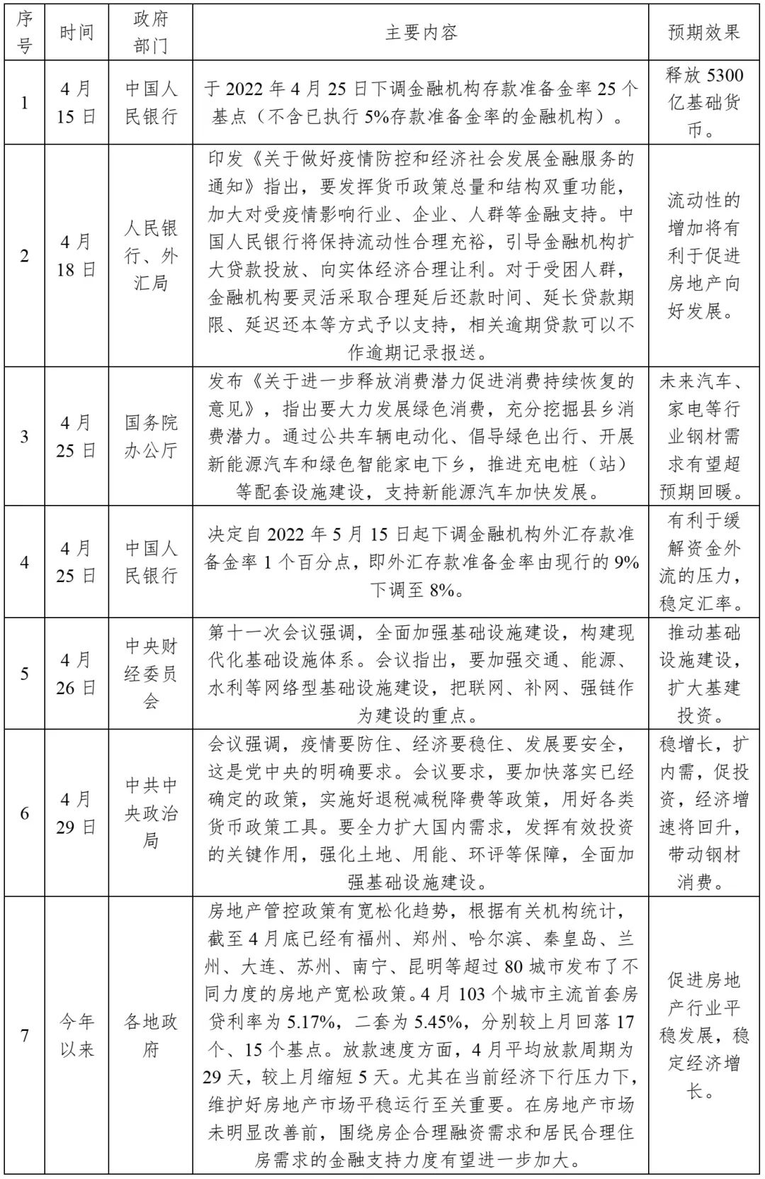 二是資金流動(dòng)性充足,有力支撐投資增長(zhǎng)和鋼材需求。4月15日中國(guó)人民銀行下調(diào)金融機(jī)構(gòu)存款準(zhǔn)備金率25個(gè)基點(diǎn)釋放約5300億基礎(chǔ)貨幣。2022年擬安排地方政府專項(xiàng)債券3.65萬(wàn)億元,其中一季度專項(xiàng)債發(fā)行規(guī)模約為1.46萬(wàn)億元,占全年的40%,幾乎是去年同期的4倍,預(yù)計(jì)大部分新增專項(xiàng)債將發(fā)行前移,今年專項(xiàng)債將重點(diǎn)用于交通基礎(chǔ)設(shè)施、能源、農(nóng)林水利、生態(tài)環(huán)保等方向;同時(shí),2021年四季度1.2萬(wàn)億專項(xiàng)債也將在今年一季度逐漸轉(zhuǎn)化為實(shí)物工作量。此外,一季度新增人民幣貸款8.34萬(wàn)億元,比上年同期多增了6636億元。4月1日至28日,已有約6250億元留抵退稅款退到企業(yè)賬戶,完成全年計(jì)劃留抵退稅款的41.7%左右;5月將提前退還小型和中型企業(yè)存量留抵稅額,此后還將加快大型企業(yè)退稅進(jìn)度。隨著資金流動(dòng)性的改善和資金進(jìn)一步到位,基礎(chǔ)設(shè)施建設(shè)等行業(yè)投資力度將進(jìn)一步加大,固定投資增速有望持續(xù)攀升,進(jìn)而拉動(dòng)鋼鐵消費(fèi)進(jìn)一步釋放。