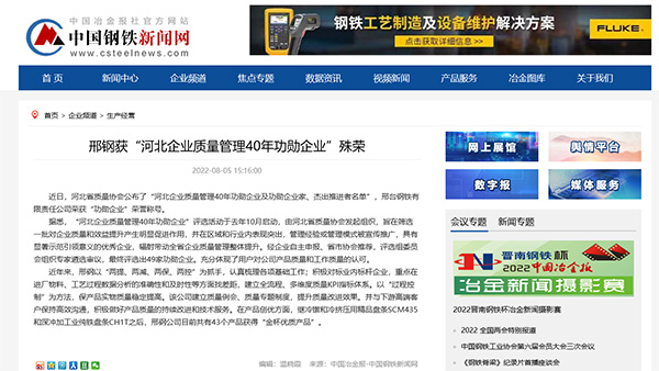 近日,河北省質量協(xié)會公布了“河北企業(yè)質量管理40年功勛企業(yè)及功勛企業(yè)家、杰出推進者名單”,邢臺鋼鐵有限責任公司榮獲“功勛企業(yè)”榮譽稱號。