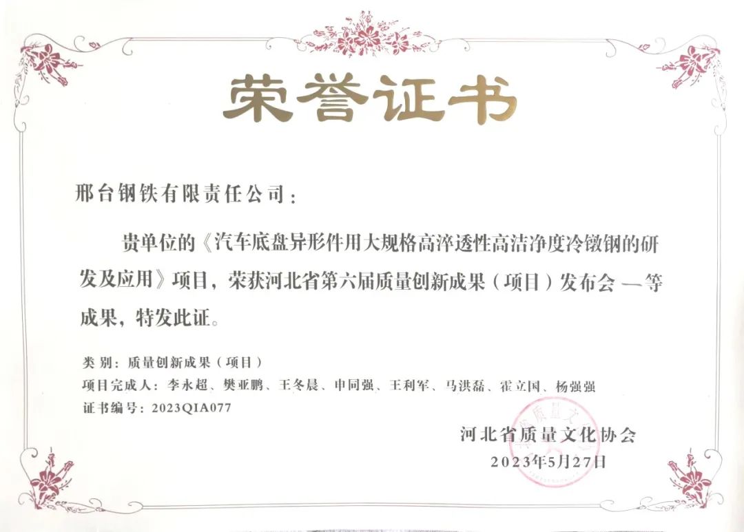 從近日召開的河北省第六屆質(zhì)量創(chuàng)新成果(項目)發(fā)布會上獲悉:邢臺鋼鐵有限責任公司(以下簡稱邢鋼)再次斬獲多項省級質(zhì)量創(chuàng)新成果殊榮,其中:《汽車底盤異形件用大規(guī)格高淬透性高潔凈度冷鐓鋼的研究及應(yīng)用》、《提高超低碳鋼成品碳含量≤50ppm比例》、《優(yōu)質(zhì)碳素鋼拉拔斷裂問題的改善與研究》榮獲示范級質(zhì)量創(chuàng)新成果;《提高6#高爐生鐵產(chǎn)量》和《全流程能效監(jiān)管系統(tǒng)的搭建與應(yīng)用》榮獲專業(yè)級質(zhì)量創(chuàng)新成果;《降低成品線材擦劃傷率》榮獲改進級質(zhì)量創(chuàng)新成果。