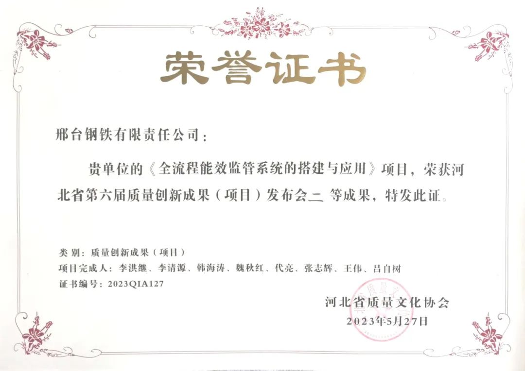 多年來,秉承“干成事”的核心價值觀,積極踐行特鋼精品戰(zhàn)略,邢鋼在轉(zhuǎn)型升級的高質(zhì)量發(fā)展過程中,走出了一條創(chuàng)新型標桿道路。作為河北省質(zhì)量文化協(xié)會會員單位,邢鋼已連續(xù)多年應(yīng)邀參加“河北省質(zhì)量創(chuàng)新成果發(fā)布會”,截至目前,邢鋼已經(jīng)累計榮獲河北省質(zhì)量創(chuàng)新示范級成果12項、專業(yè)級成果11項、改進級成果5項。