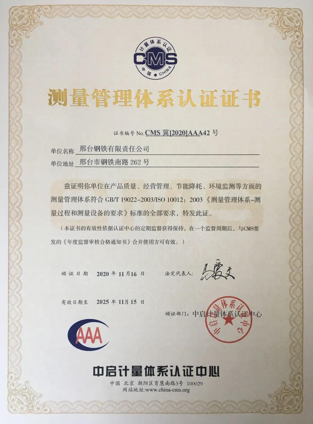 近日,邢鋼正式獲得由中啟認證中心頒發(fā)的AAA級«測量管理體系年度監(jiān)督審核合格通知書»,該證書是測量管理體系認證的最高等級證書,證書的持續(xù)取得,標志著我公司測量管理水平已達到國家和國際標準要求。