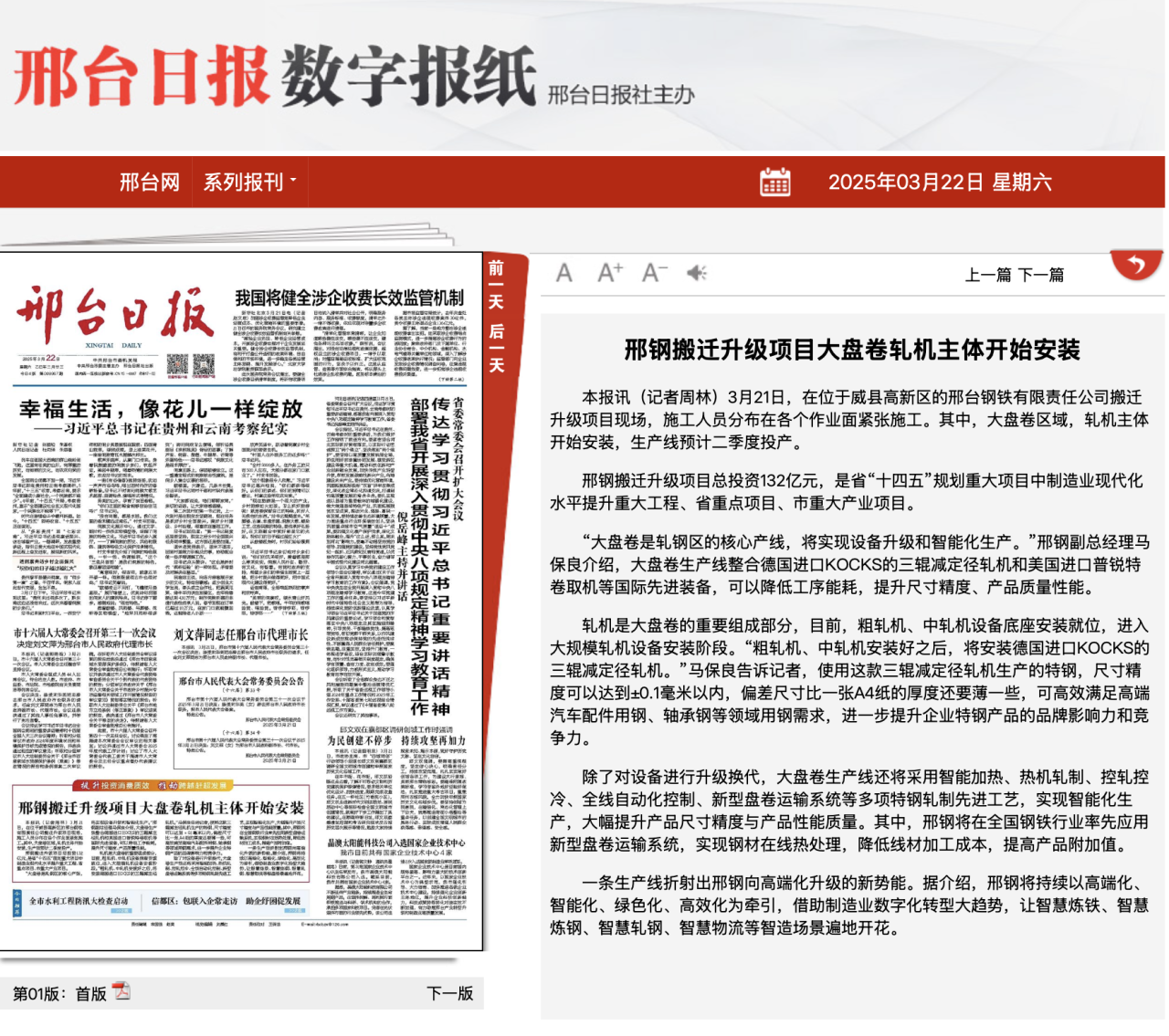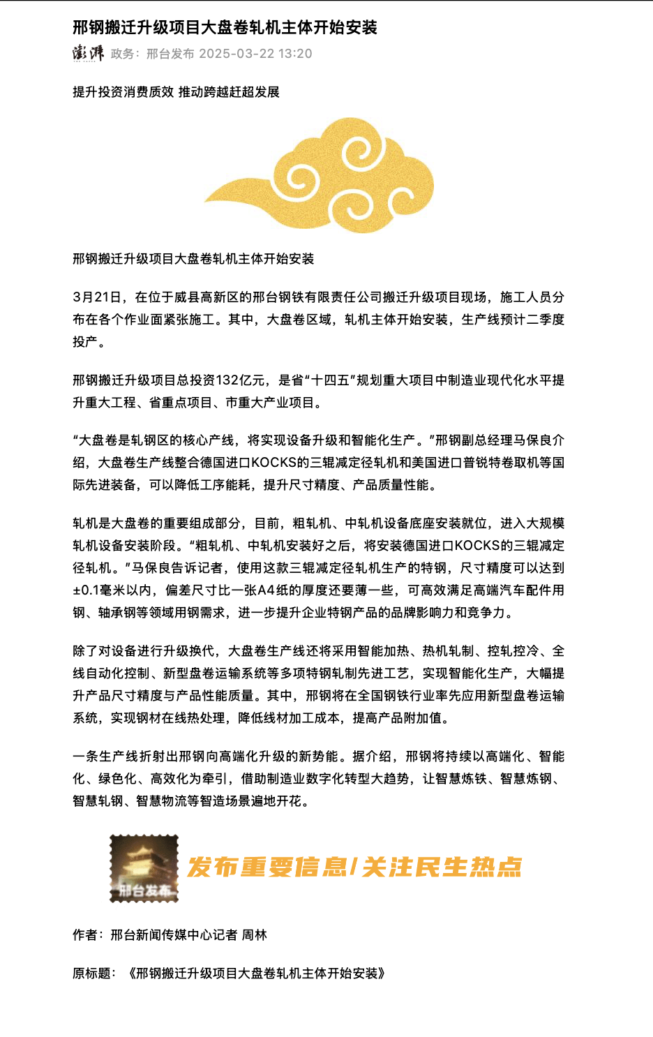 邢鋼搬遷升級(jí)項(xiàng)目總投資132億元,是省“十四五”規(guī)劃重大項(xiàng)目中制造業(yè)現(xiàn)代化水平提升重大工程、省重點(diǎn)項(xiàng)目、市重大產(chǎn)業(yè)項(xiàng)目。 “大盤(pán)卷是軋鋼區(qū)的核心產(chǎn)線,將實(shí)現(xiàn)設(shè)備升級(jí)和智能化生產(chǎn)。”邢鋼副總經(jīng)理馬保良介紹,大盤(pán)卷生產(chǎn)線整合德國(guó)進(jìn)口KOCKS的三輥減定徑軋機(jī)和美國(guó)進(jìn)口普銳特卷取機(jī)等國(guó)際先進(jìn)裝備,可以降低工序能耗,提升尺寸精度、產(chǎn)品質(zhì)量性能。